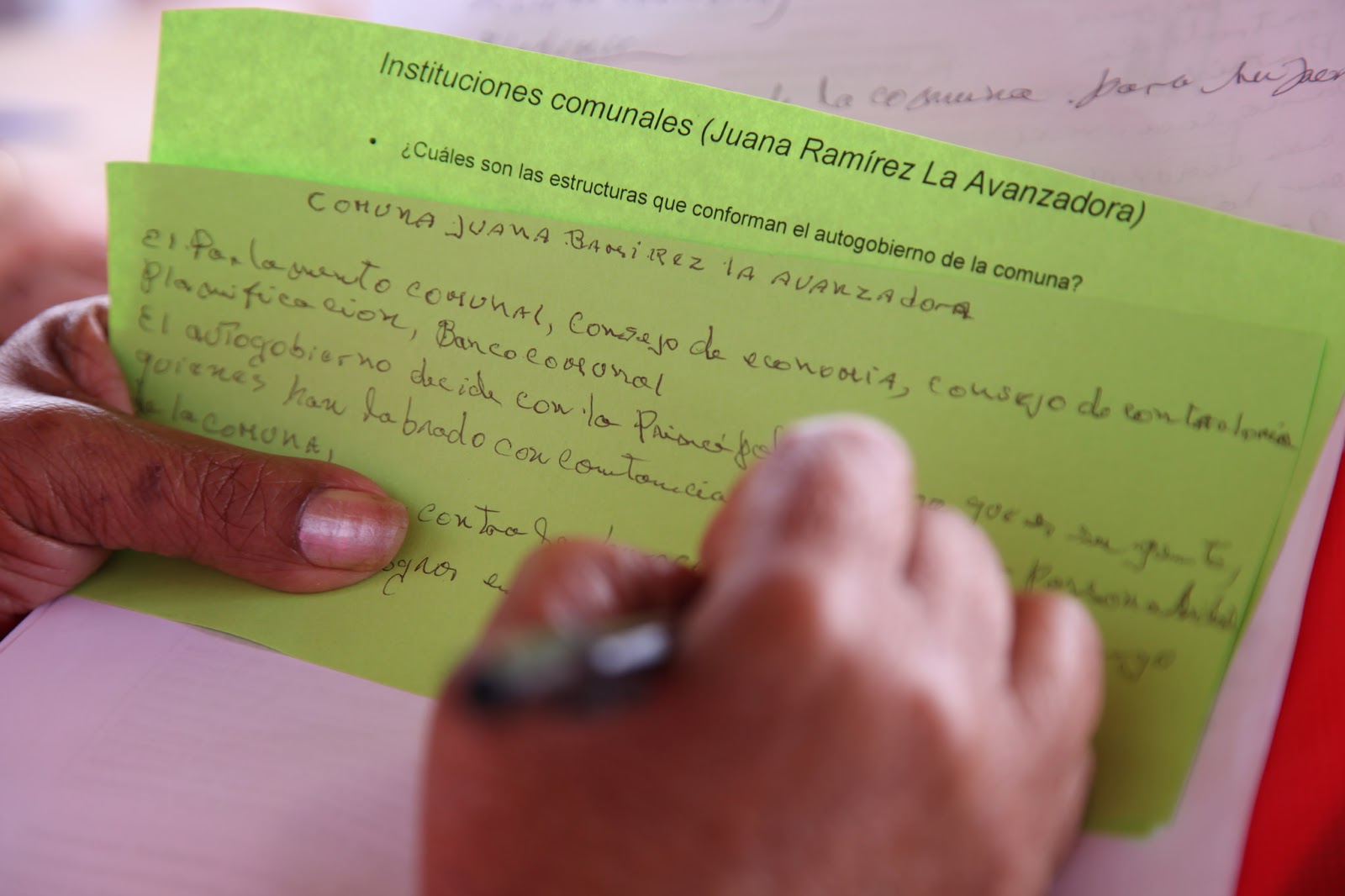 Una de las problematizaciones más importantes tuvo que ver con el avance en el proceso de transferencia de competencias y con las posibilidades concretas y justas de desarrollar experiencias de cogestión con el Estado. Lxs comuneros se plantean un impacto en la economía nacional y no sólo la local, por lo que algunas se proponen además de la producción de materias primas, su transformación, distribución y comercialización. Agregó el vocero de Cajigal Augusto Espinoza que “se pueden llegar a acuerdos con el Estado para contribuir con el control de las políticas de importación”.