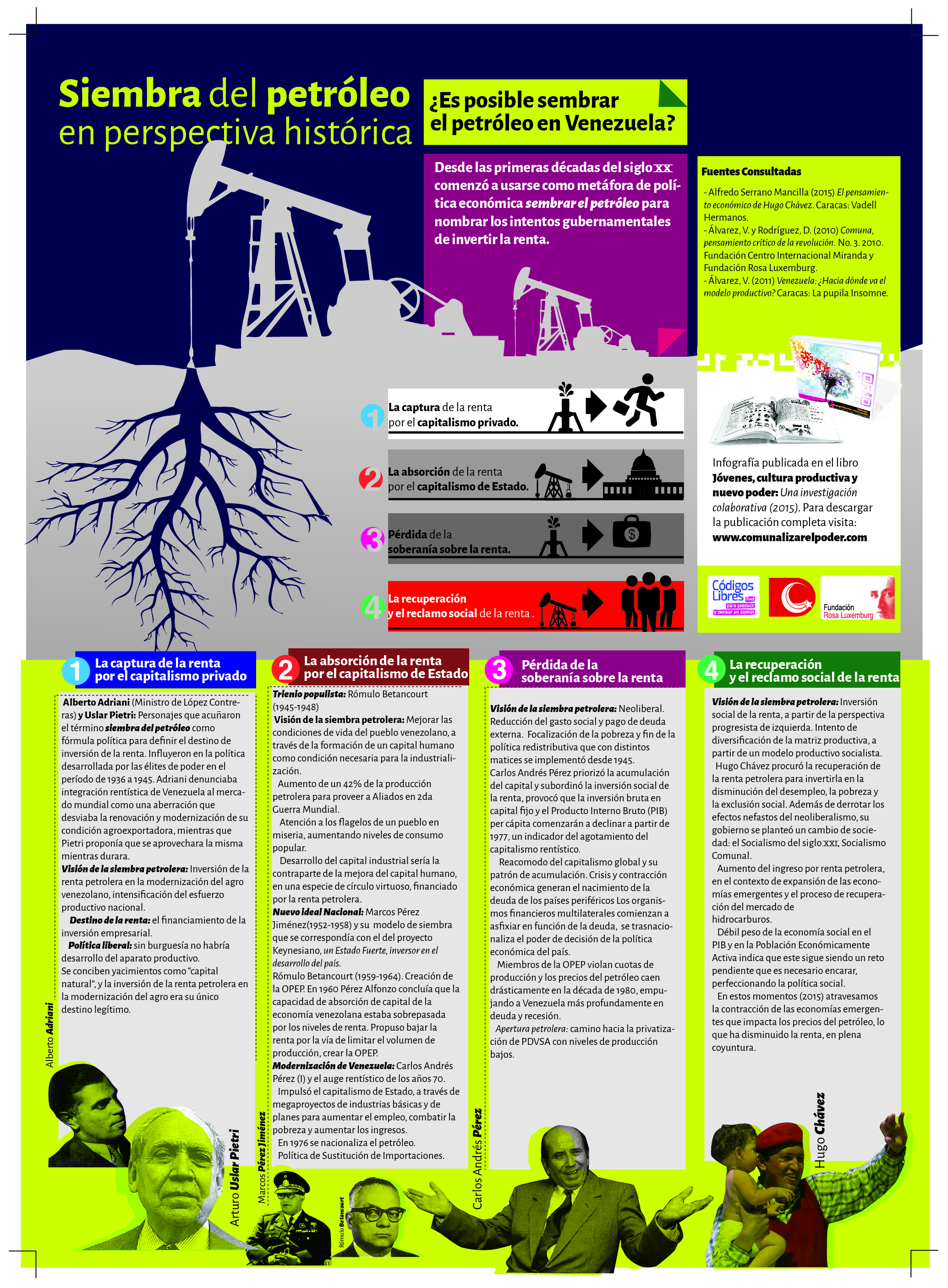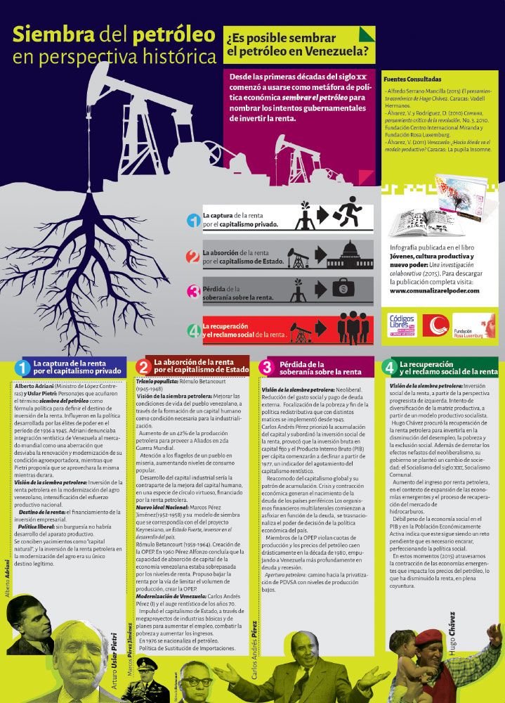 Desde las primeras décadas del siglo XX comenzó a usarse como metáfora de una política económica sembrar el petróleo para nombrar los intentos de invertir los ingresos de la renta petrolera en el desarrollo de otras actividades económicas y sociales. Este material busca mostrar de manera sintética cuál fue el énfasis de las políticas de distribución de la renta en los distintos gobiernos del siglo XX para finalizar con el análisis del período bolivariano en este siglo XXI.